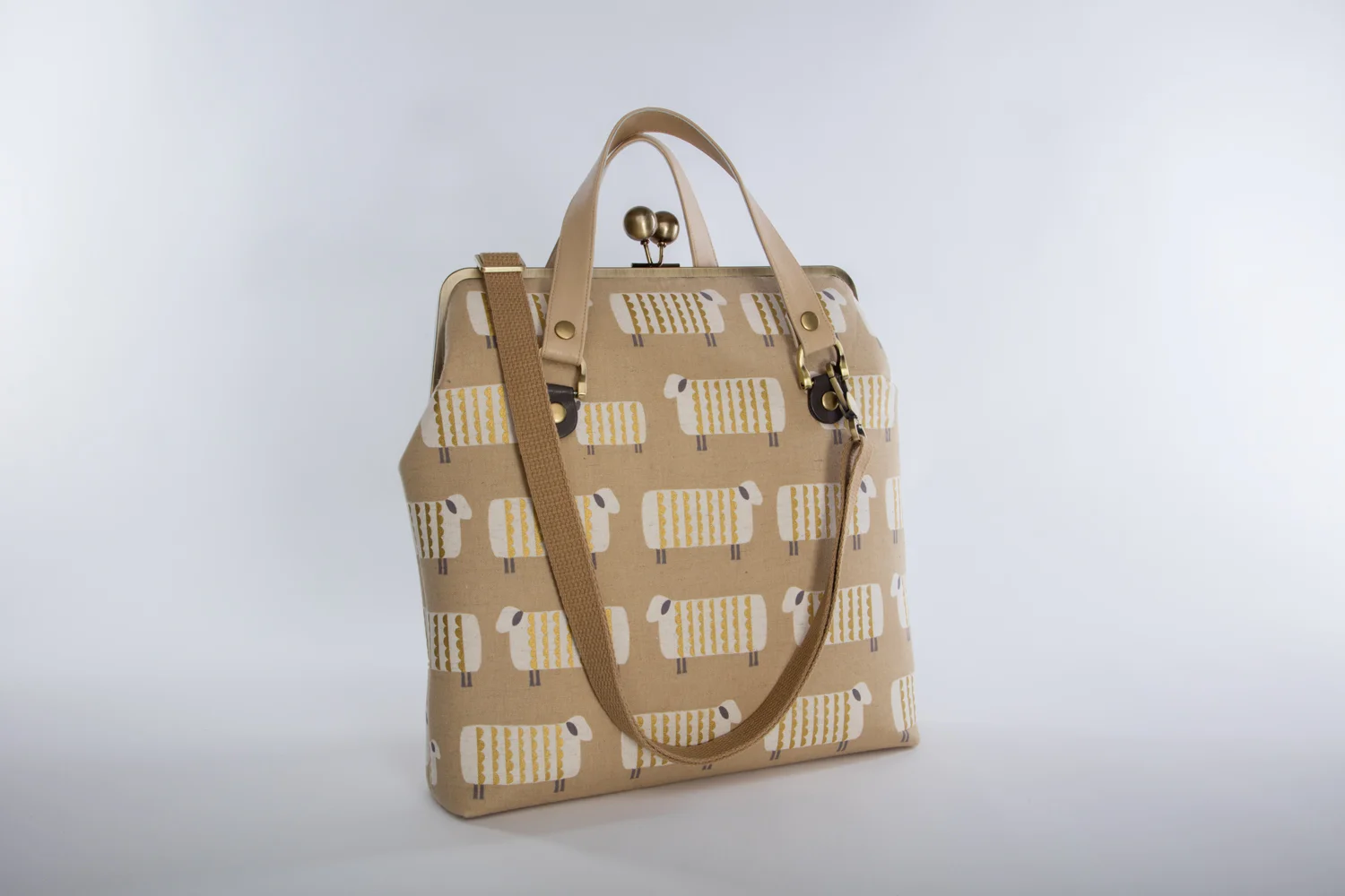 A vertical brief case. Why not? With sheep. And why not? Your folders and files will stand up smartly in this unusual briefcase. Styled just like a giant purse it will bring a little fun into the office. The pretty sheep with their metallic gold stripey coats match perfectly with the antique gold coloured frame. Soft leather handles and toning, adjustable, detachable webbing strap make this a very practical briefcase. Lined in plain dark grey fabric with two internal pockets.